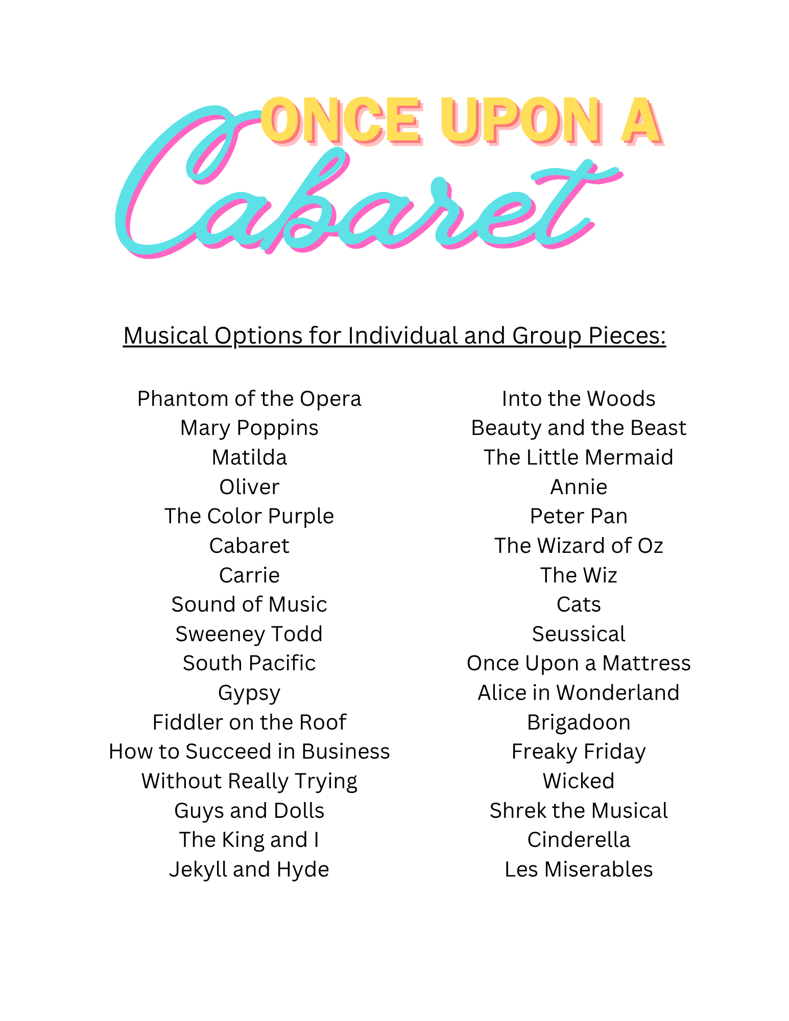 An interdisciplinary musical revue built around fairy tale themes, this production featured student-choreographed numbers and collaborative storytelling. Students chose songs, created linking scenes, and directed the pacing and tone of the show. It culminated in a multi-style performance designed to showcase ensemble growth.